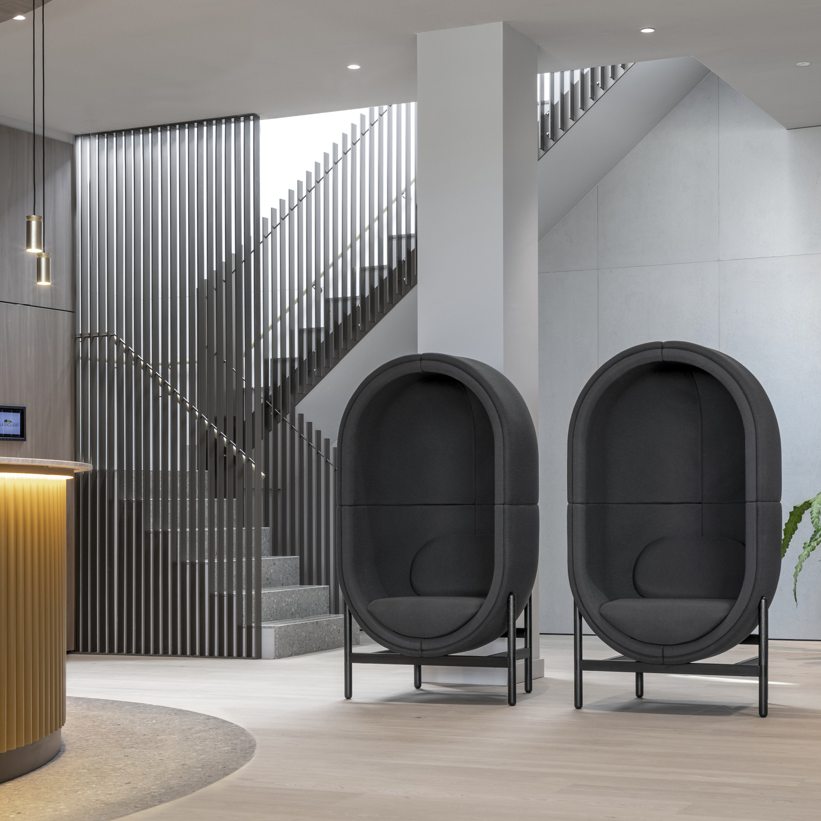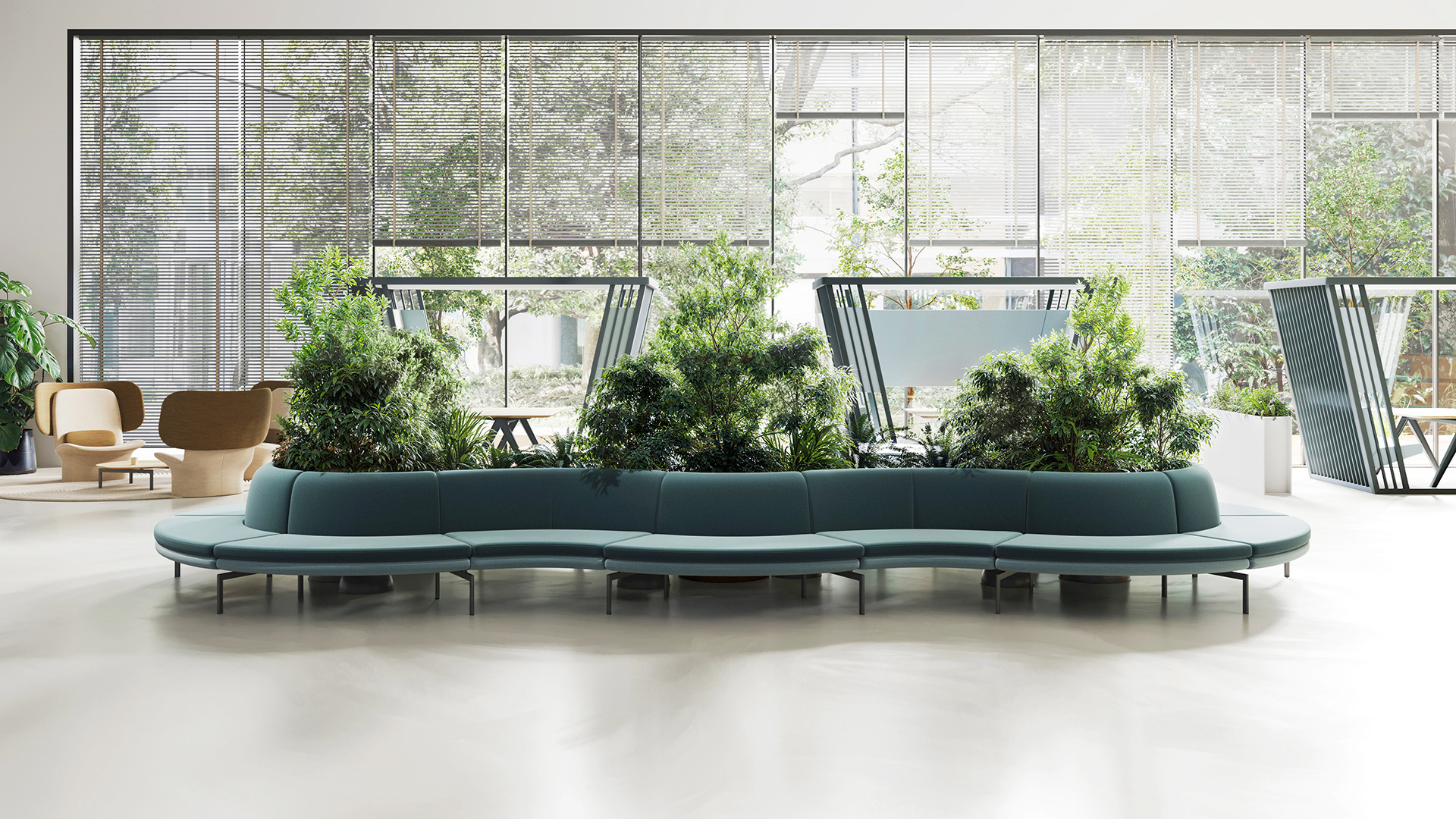 The modular seating programme Riva is more versatile than ever. The addition of curved seating elements opens the door to even more organic configurations for business interiors. The wall elements make it easy to apply zoning in open environments.
