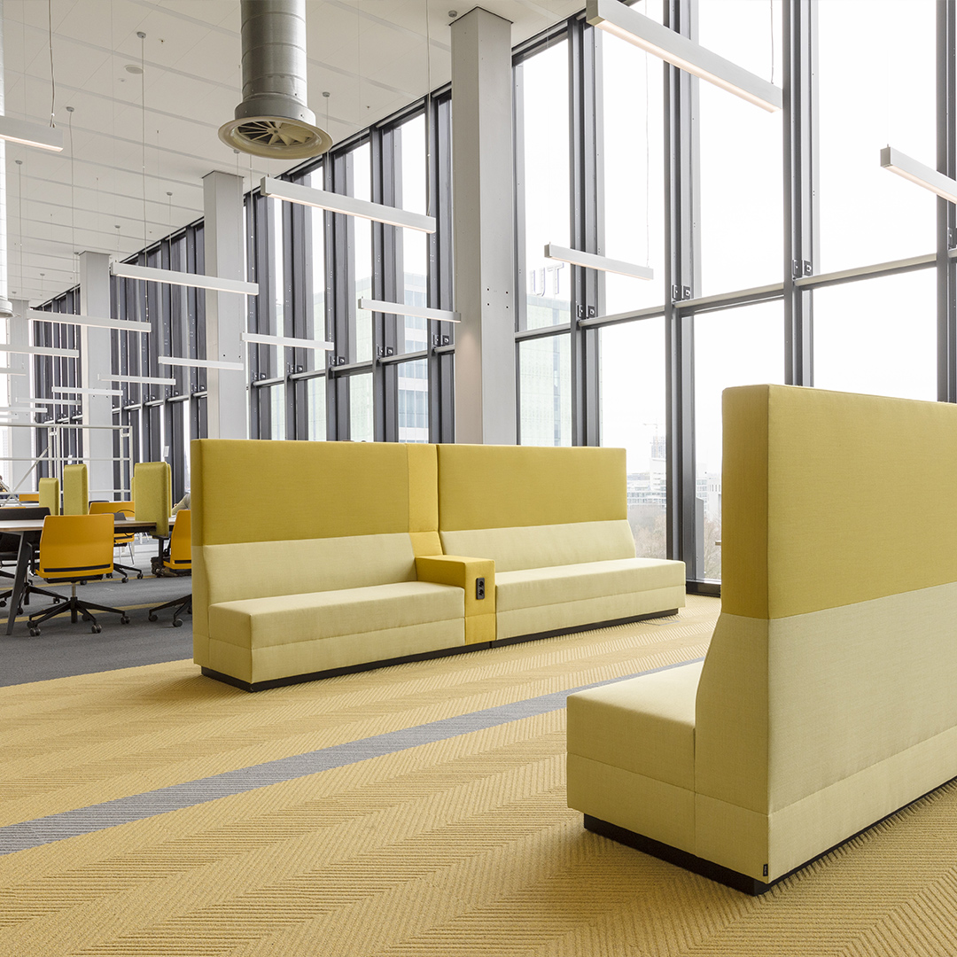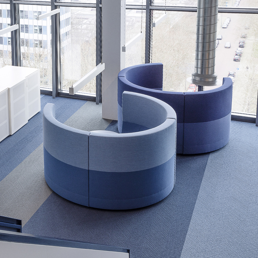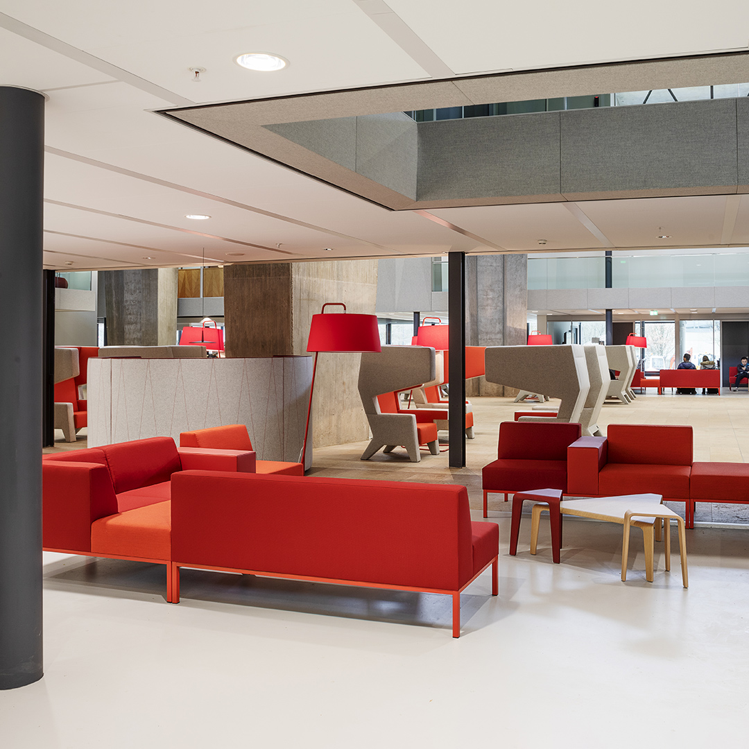 TU/e entschied sich mit dem modularen Soft-Seating-Programm Bricks für nachhaltige und flexible Qualitätsmöbel. Bricks bietet Lösungen für verschiedene Funktionen und Anwendungen. Durch die Kombination verschiedener Elemente, Untergestelle und Stoffe entsteht immer ein anderer Look, ohne dass der Zusammenhalt verloren geht. Die Sofas gliedern den offenen Arbeitsbereich und fungieren gleichzeitig als räumliche und akustische Elemente. Die runde, offene Form der Gruppenarbeitsplätze lädt zu Beratungen und Projektarbeit ein. Die akustischen Eigenschaften sind ideal für offene Räume.