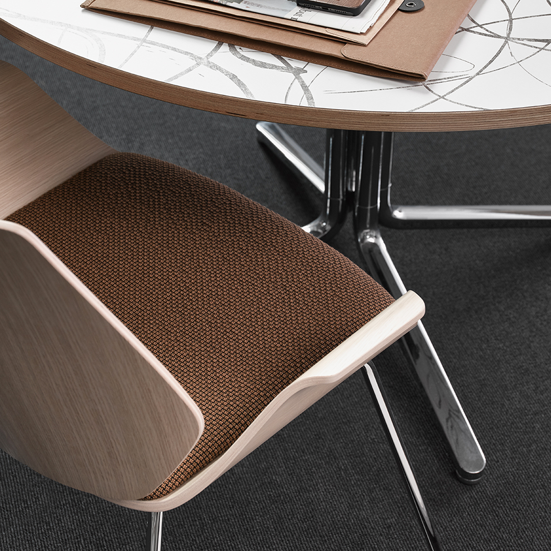 Der geformte Schaumstoffsitz bewahrt seine elegante Silhouette selbst bei intensiver Nutzung. Mit wahlweise niedriger oder hoher Rückenlehne bietet Centuro eine passgenaue Lösung für unterschiedliche Besprechungsumgebungen. Die verdeckte Verbindung zwischen Sitz und Rückenlehne schafft ein ruhiges, durchgängiges Design, das natürliche Bewegungen unterstützt und auch bei langen Sitzungen dauerhaften Komfort gewährleistet.