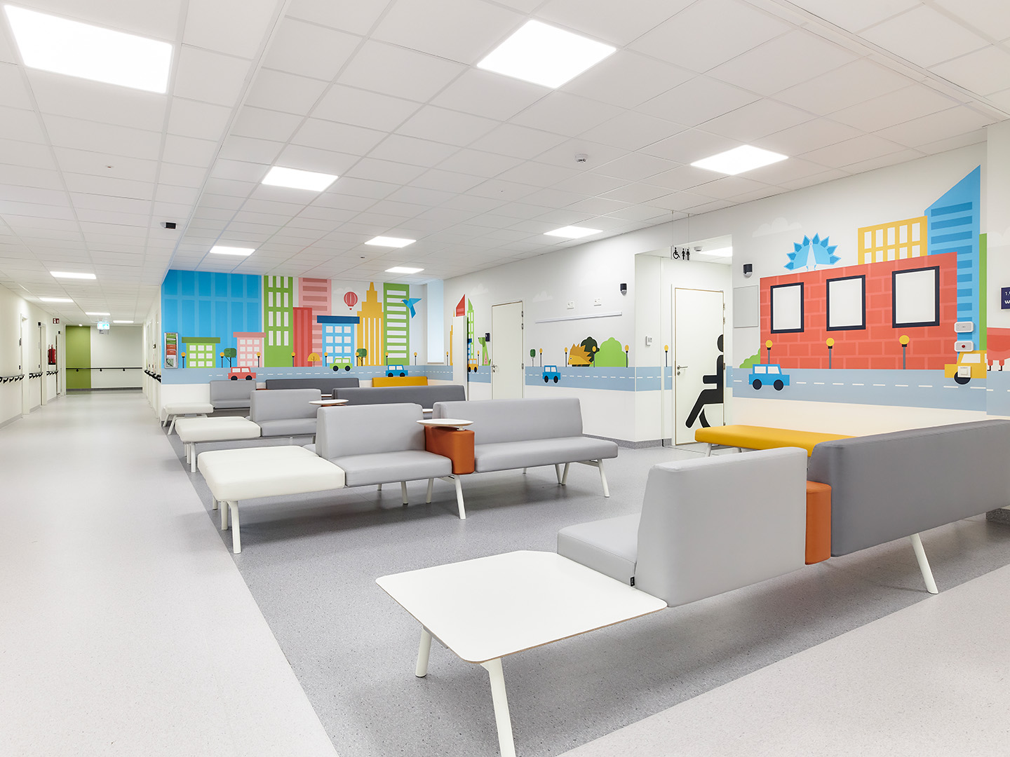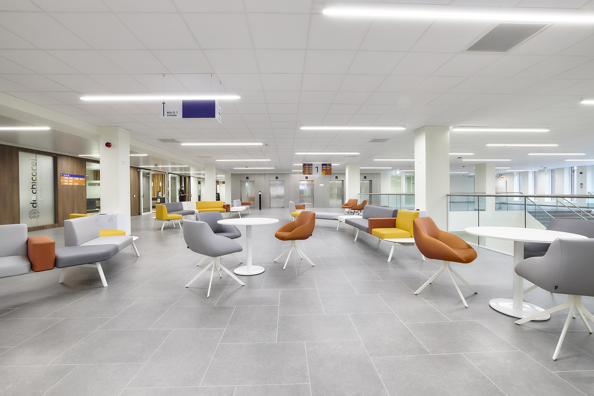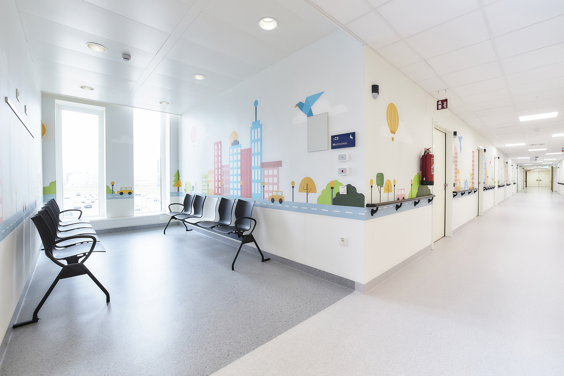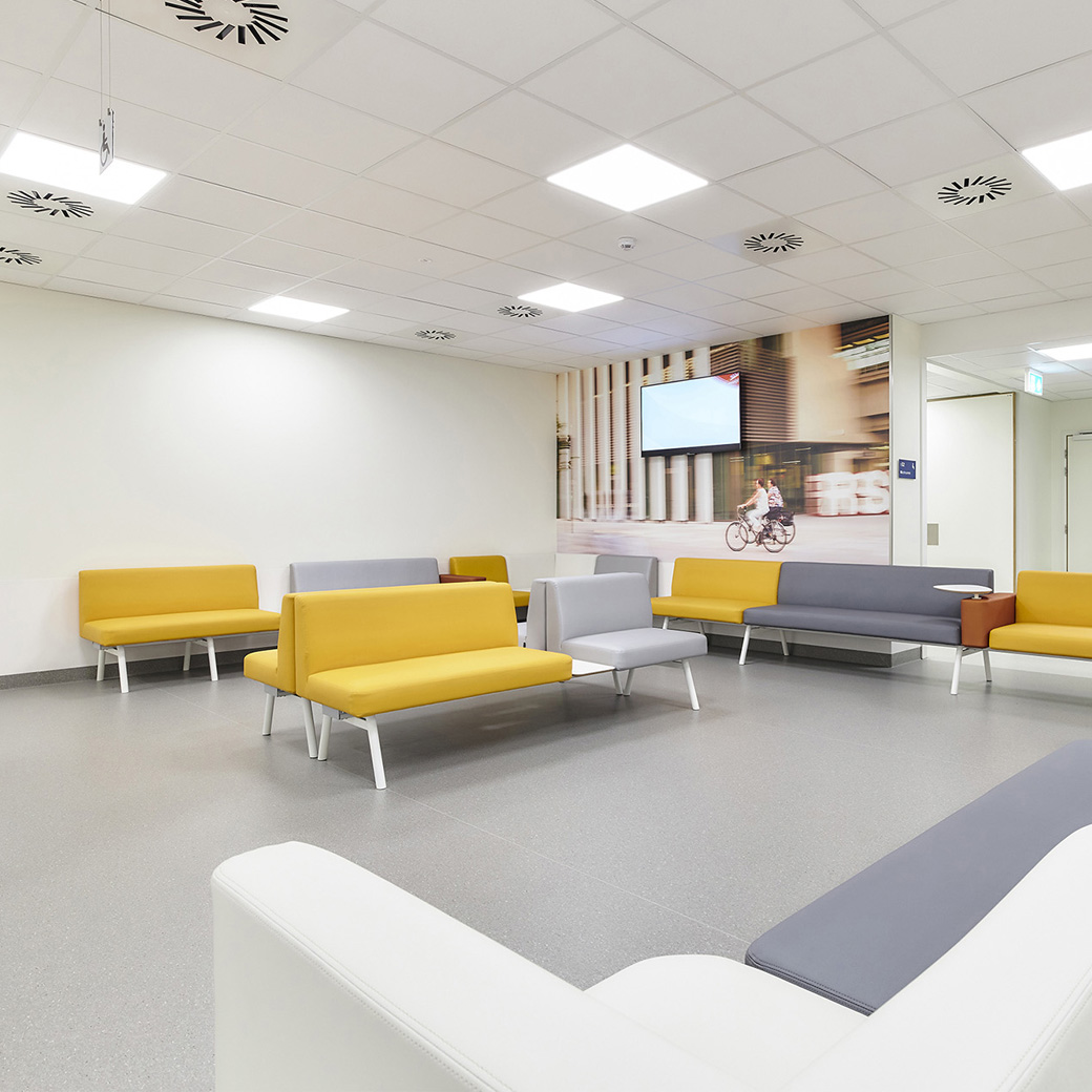 Rosine Herpoel, Healthcare construction coordinatorDie Patientenzimmer sowie unter anderem die Wartebereiche der Kinder- und Onkologieabteilung befinden sich auf der ruhigen Rückseite des Krankenhauses mit Blick auf die weite Landschaft. Hier wurde modulares, weiches Sitzmöbel der Serie Corals in warmen Farben eingesetzt. Die wichtigsten Gründe dafür sind Flexibilität, Ergonomie und Hygiene. Die Sitzelemente bestehen aus einem abwaschbaren Stoff mit nur einer Naht vom Rücken zur Sitzfläche. Nosag-Federn und ergonomisch geformte Elemente sorgen für höchsten Sitzkomfort. Da die Elemente auf einem Aluminium-Extrusionsprofil montiert sind, lässt sich die Anordnung leicht anpassen oder erweitern.