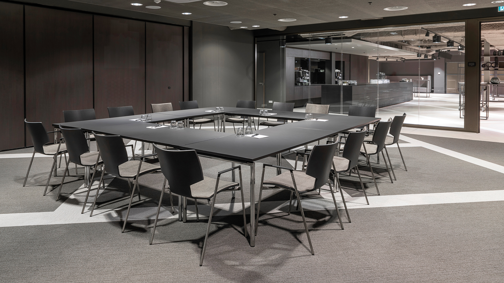 Met een lichtgewicht tafelblad biedt de Lacrosse tafel extra efficiëntie en ergonomie bij het klaarzetten en aanpassen van opstellingen in multifunctionele ruimtes.