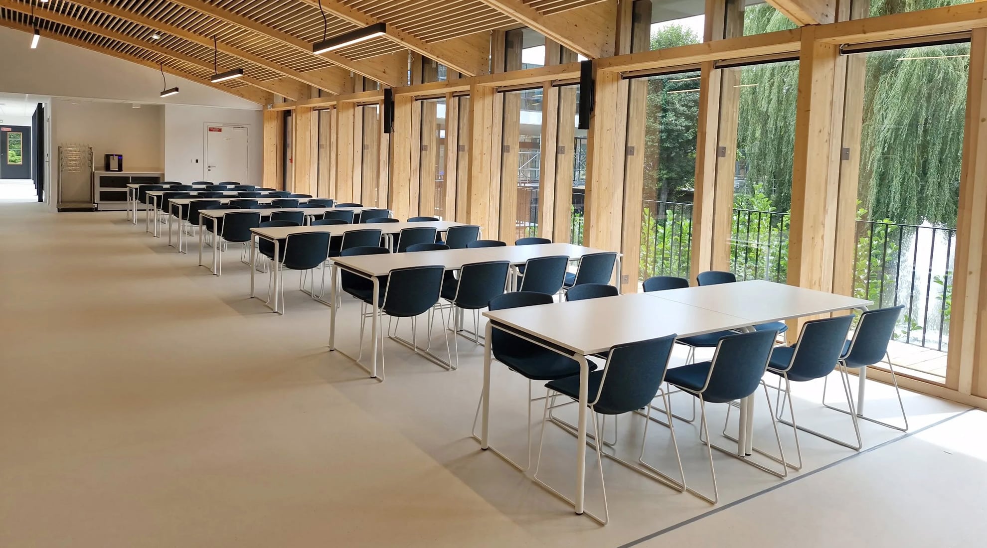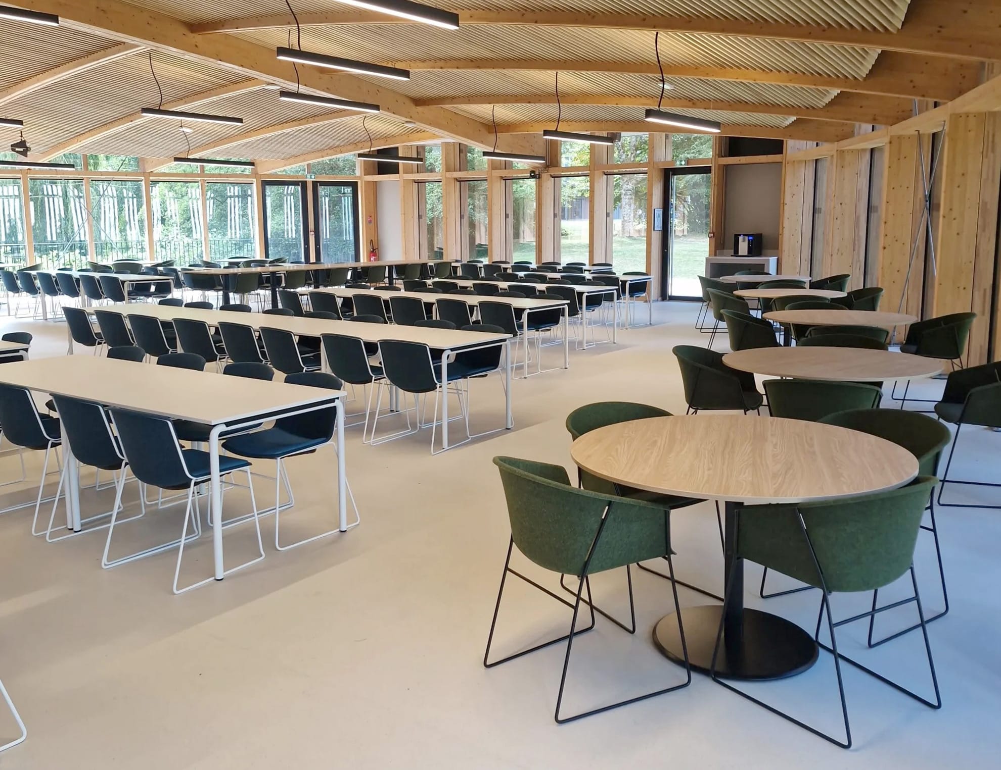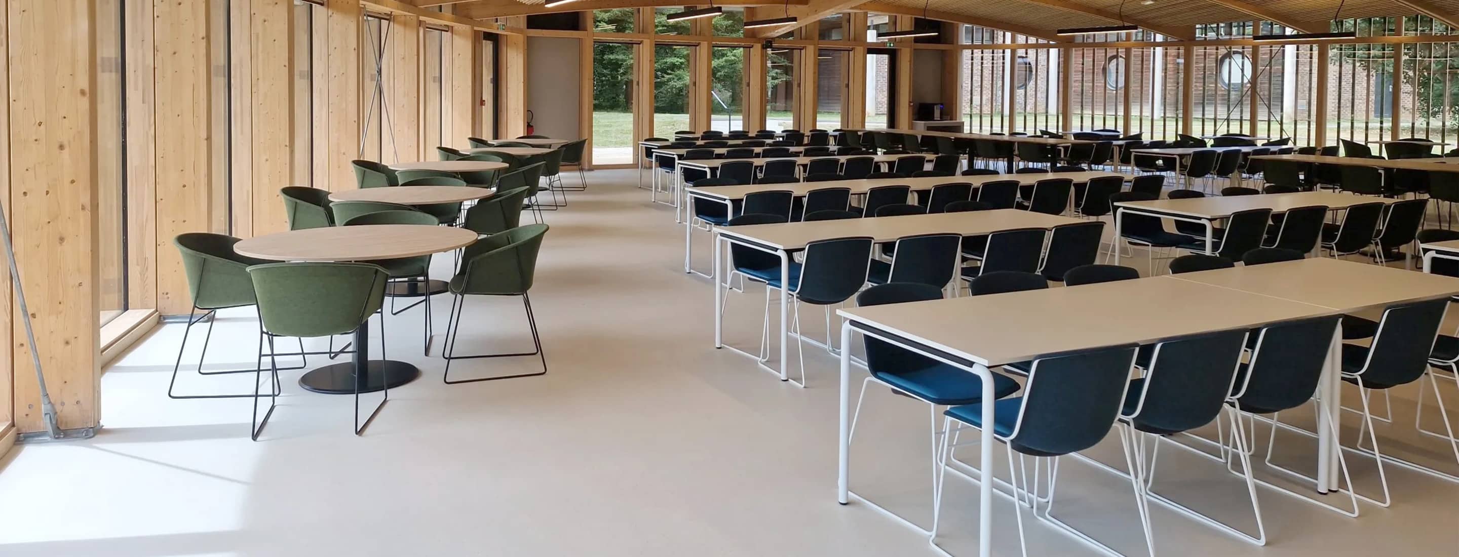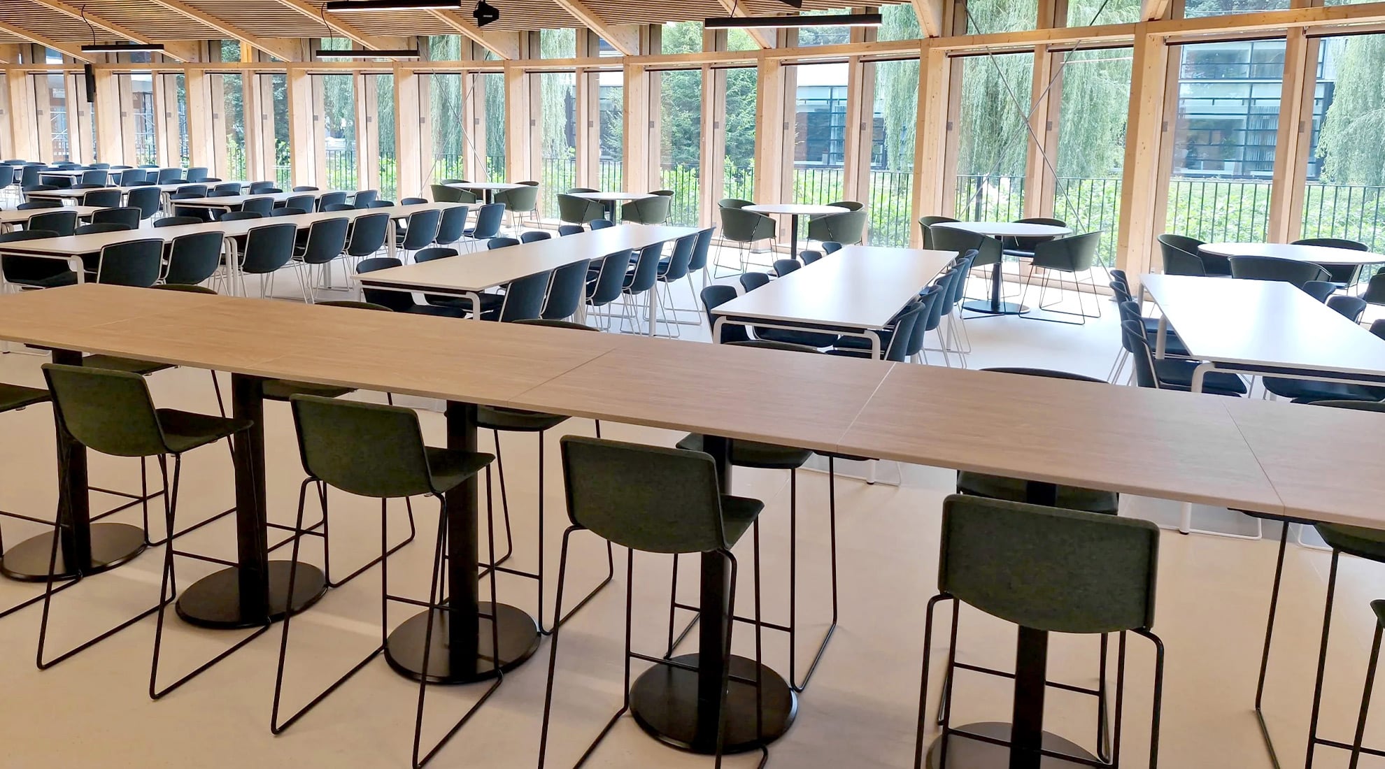 Langs de raampartijen staan ronde Blender tafels in HPL met houtdecor tafelblad, gecombineerd met mosgroene, vilten Omega stoelen met opdekstoffering. Zowel de tafels als stoelen hebben een zwart gepoedercoat onderstel. In het midden staan Blender tafels op counterhoogte met HPL houtdecor tafelblad en vilten Omega barkrukken. Voor flexibel gebruik zijn er Lacrosse klaptafels met witte tafelbladen en blauwe vilten Omega stoelen, beide met een wit onderstel.